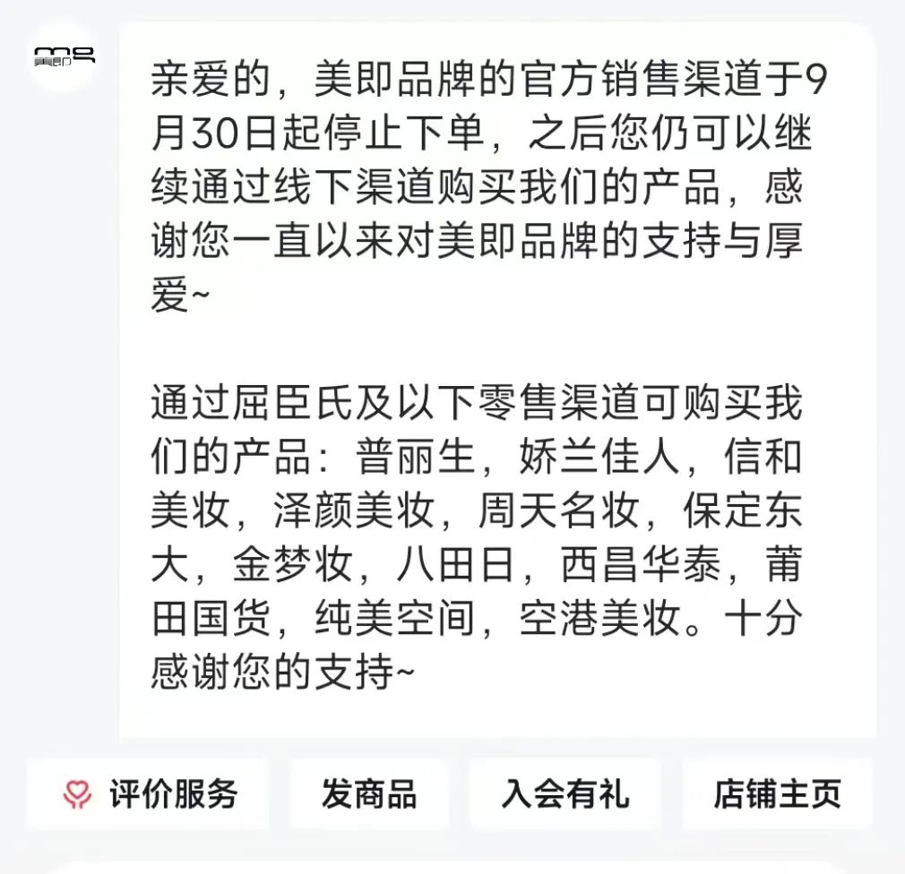 据悉,美即将全面退出线上平台,消费者可通过屈臣氏以及娇兰佳人等线下渠道购买。