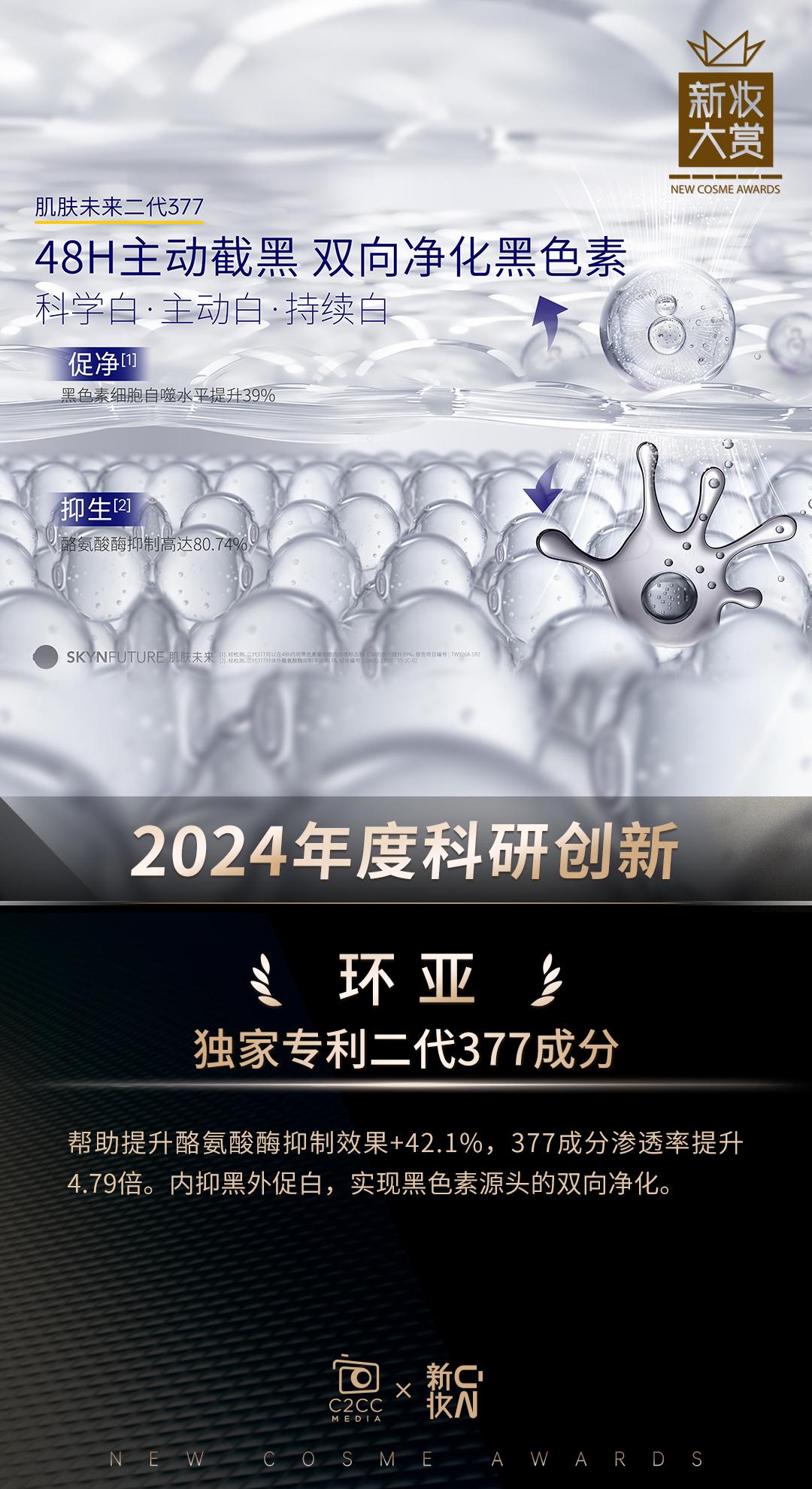 作为环亚集团旗下科学美白专研品牌,肌肤未来致力于为消费者提供科学美白方案。自2019年创立以来,肌肤未来便专注于科学美白的探索,瞄准377美白成分(苯乙基间苯二酚)的美白潜力,与全球知名原料供应商德之馨合作共研出了更适合国人消费者肤质的377美白产品,成为国内研究推广377美白成分的先行者与引领者。