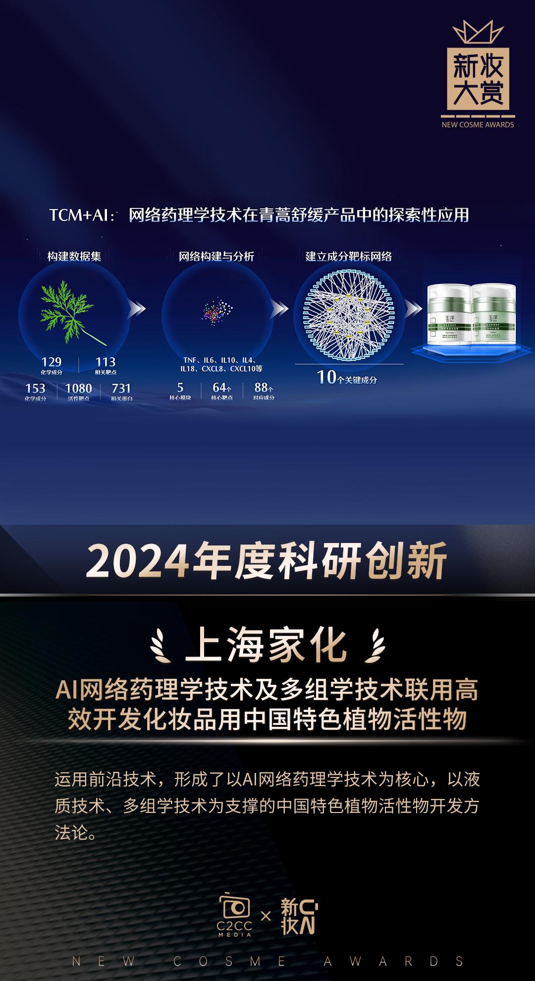 基于此,上海家化通过综合应用当前药学领域的前沿技术,形成了以AI网络药理学技术为核心,以液质技术、多组学技术为支撑的适合中国特色植物活性物开发的一套方法论。突破了传统植物活性物单靶点体外筛选方法的低效率、随机性、低覆盖的技术局限性,实现了对中国特色植物从“成分-靶点-功效”更快速更立体更全面的挖掘和阐述,可以快速发现中国特色植物的活性成分及其作用靶点,提高中国特色植物护肤的精准性和科技感。目前已经成功应用在青蒿、御五行等家化特色活性物中,为中国特色植物的美容应用开发提供了很好的范例。