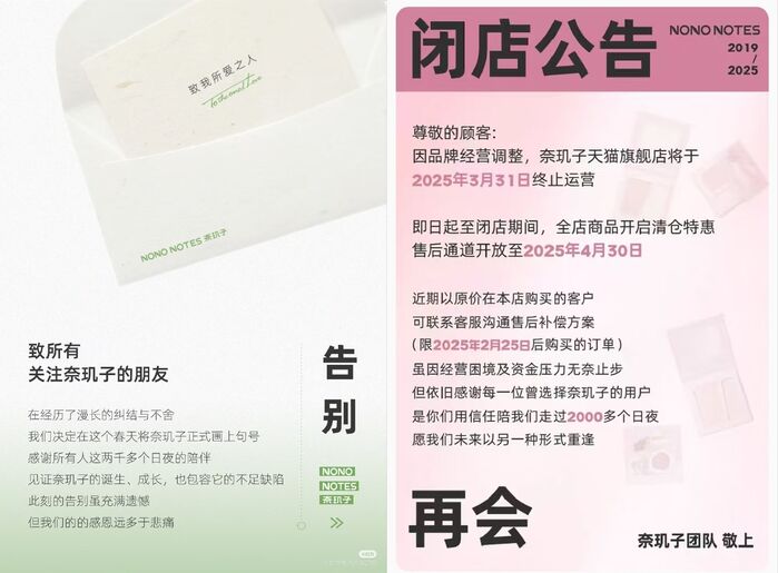 3月5日,创立于2019年的新锐美妆品牌奈玑子在小红书发布品牌告别信,称奈玑子各平台官方店铺将于2025年3月底陆续停止销售,售后服务将持续至2025年4月30日。截至目前,奈玑子天猫旗舰店已发布闭店公告,称店铺将于2025年3月31日终止运营。