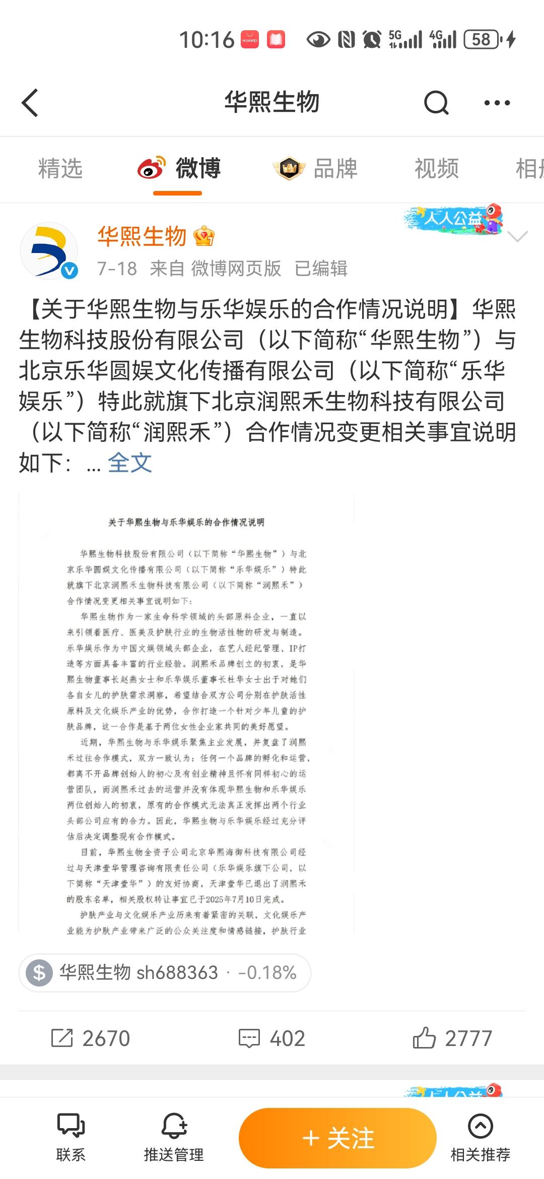 7月18日,华熙生物官方微博突然发布公告,宣布旗下儿童护肤品牌"润熙禾"的另一大股东——乐华娱乐旗下天津壹华管理咨询有限责任公司(以下简称“天津壹华”),已于7月10日完成股权退出。这一纸公告,正式宣告了这场曾备受瞩目的"护肤+娱乐"跨界合作走向终结。