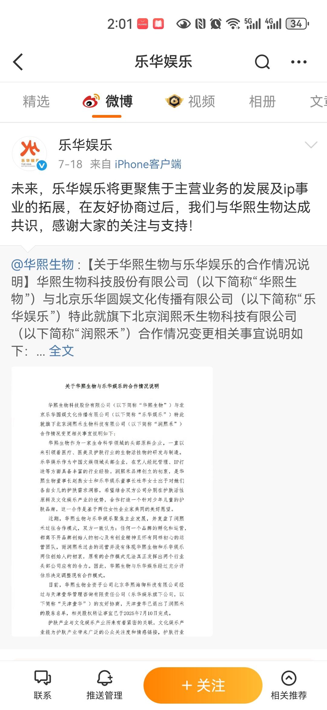 乐华娱乐随后在微博转发了华熙生物的声明,并以"友好协商"形容此次退出过程。值得玩味的是,乐华娱乐特别强调"未来将更聚焦主业发展",这一表态似乎暗示着此次退出并非单纯的战略收缩,而是乐华娱乐在多元化尝试后的一次重要转向。