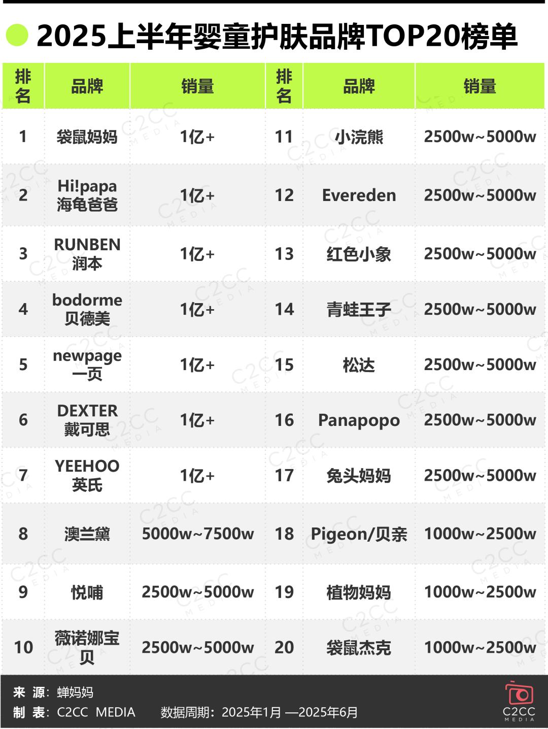 根据蝉妈妈数据,2025年上半年,袋鼠妈妈、海龟爸爸、润本、贝德美、一页拿下抖音婴童护肤TOP5,GMV均超1亿。戴可思、英氏、悦哺、薇诺娜宝贝挤前10,TOP10品牌中,国货拿下9个席位。TOP20榜单品牌中,国货占据17席。