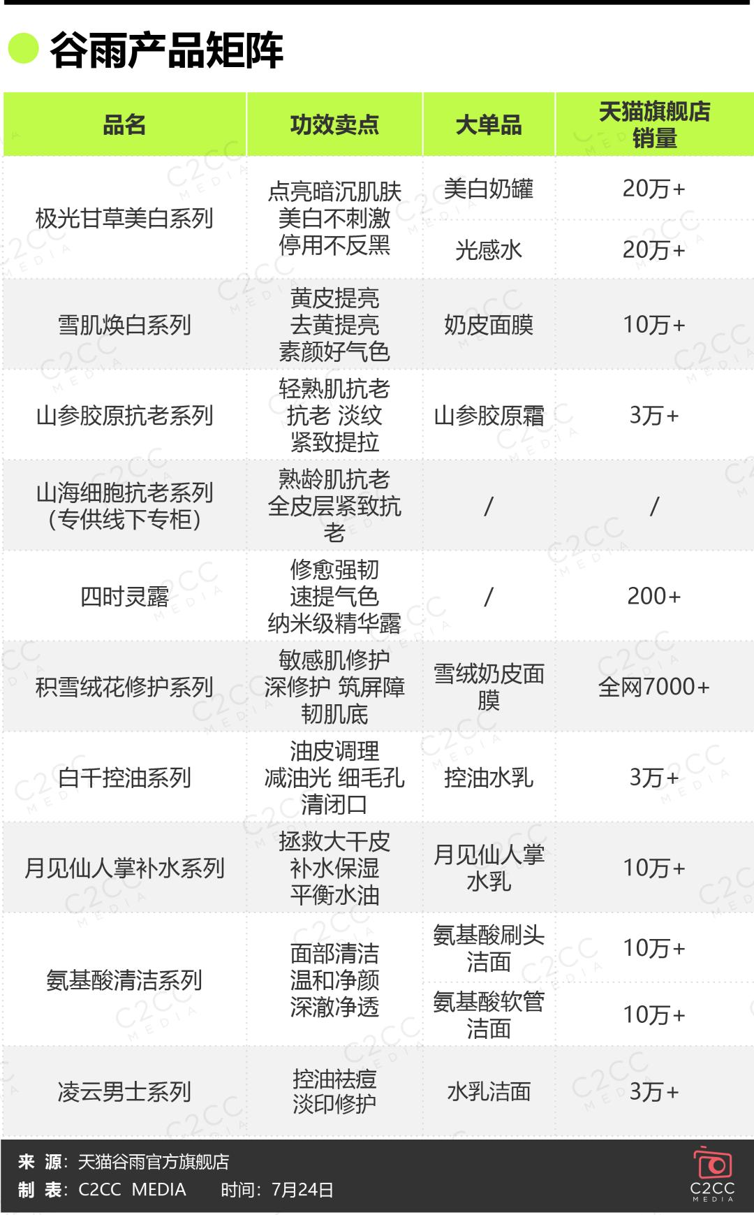 结合上述谷雨产品矩阵表,从销售数据看,谷雨的美白大单品、氨基酸洁面、月见仙人掌补水套装销量均超10万,展现出强大的市场竞争力。抗老、控油、男士等系列产品销量也已超3万,呈现出良好的增长态势,为品牌的持续发展注入新动力。谷雨通过多元化的产品矩阵,满足了不同消费者的护肤需求。