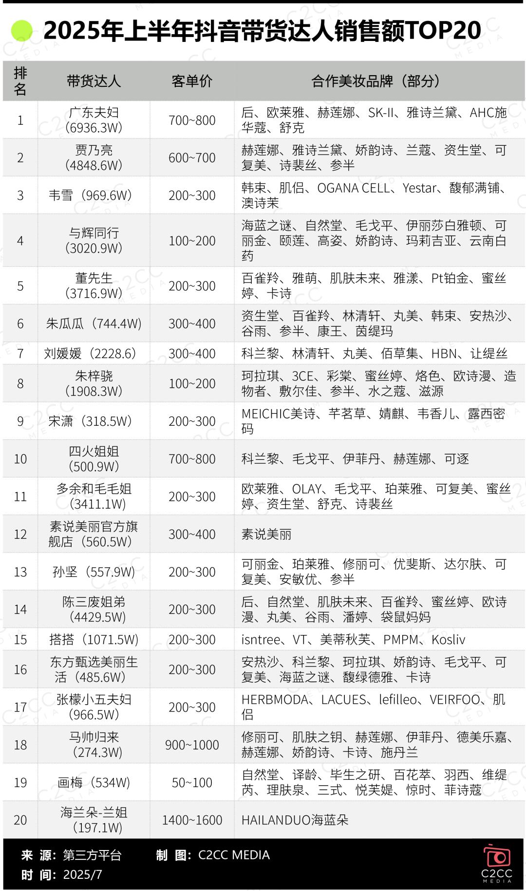 通过梳理2025年上半年抖音带货达人销售额总榜TOP20,C2CC传媒X新妆发现上榜达人可分为超头达人(粉丝数1000W+)、头部达人(粉丝数500W-1000W)、肩部达人(粉丝数100W-500W ),分别是广东夫妇、贾乃亮、与辉同行、刘媛媛等9位超头达人,韦雪、朱瓜瓜、四火姐姐等7位头部达人,以及宋潇、东方甄选美丽生活、马帅归来、海兰朵-兰姐4位肩部达人。