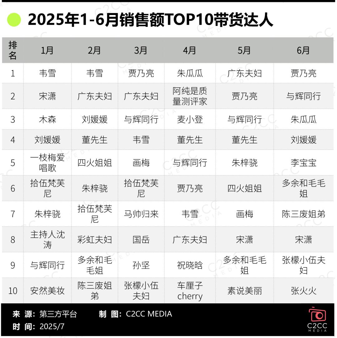 再来看月度榜单,抖音TOP级带货达人格局趋于稳定,广东夫妇、贾乃亮、韦雪、与辉同行、董先生成为榜单前五常驻;细分品类榜单流动性更高,护肤、彩妆TOP1分别由贾乃亮、朱梓骁夺得,香水垂类肩部达人霹雳乌贼表现亮眼,半年累计销售额破亿;如广东夫妇、张檬小五夫妇、彩虹夫妇等“夫妻带货”模式表现依旧强劲;宋潇等品牌创始人型达人活跃但竞争加剧,部分因合规问题退出榜单。