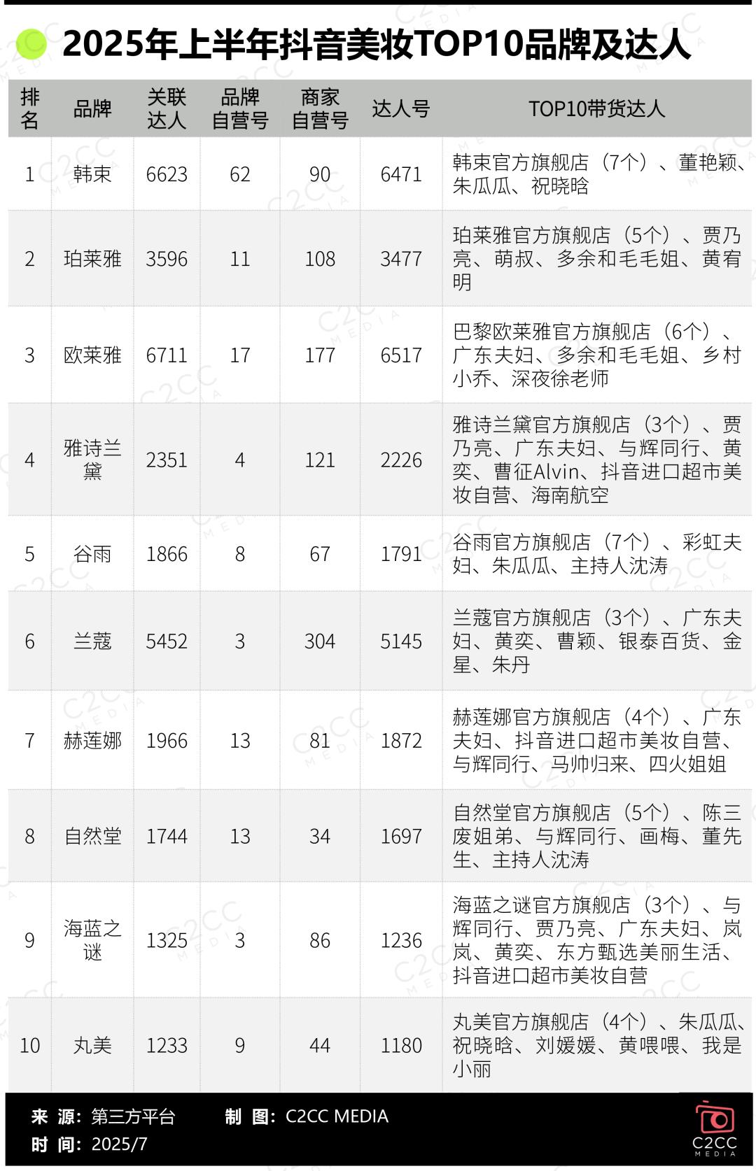 通过梳理抖音TOP10美妆品牌及带货达人数据,C2CC传媒X新妆发现不同定位的品牌基于产品特性、用户群体及营销目标,形成了差异化的达人选择逻辑。
