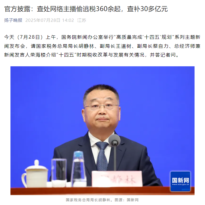 前不久,国务院新闻办公室举行“高质量完成‘十四五’规划”系列主题新闻发布会。国家税务总局在发布会上通报,2021年以来,税务部门累计查处网络主播偷逃税案件达360余起,查补税款30多亿元。