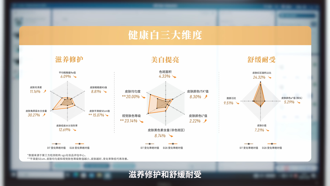 据SGS检测机构数据显示,受试者使用片仔癀牌雪肌润白精华液28天后,肌肤滋养修护、舒缓耐受和美白维度均呈现显著改善。