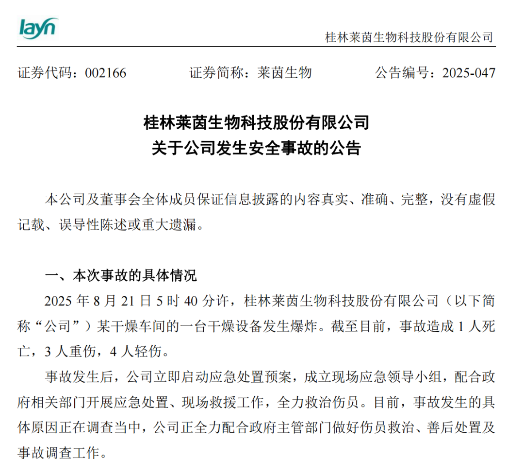 8月21日,有着“植物提取第一股”之称的桂林莱茵生物科技股份有限公司发布公告,其某干燥车间的一台干燥设备发生爆炸,事故造成1人死亡,3人重伤,4人轻伤。