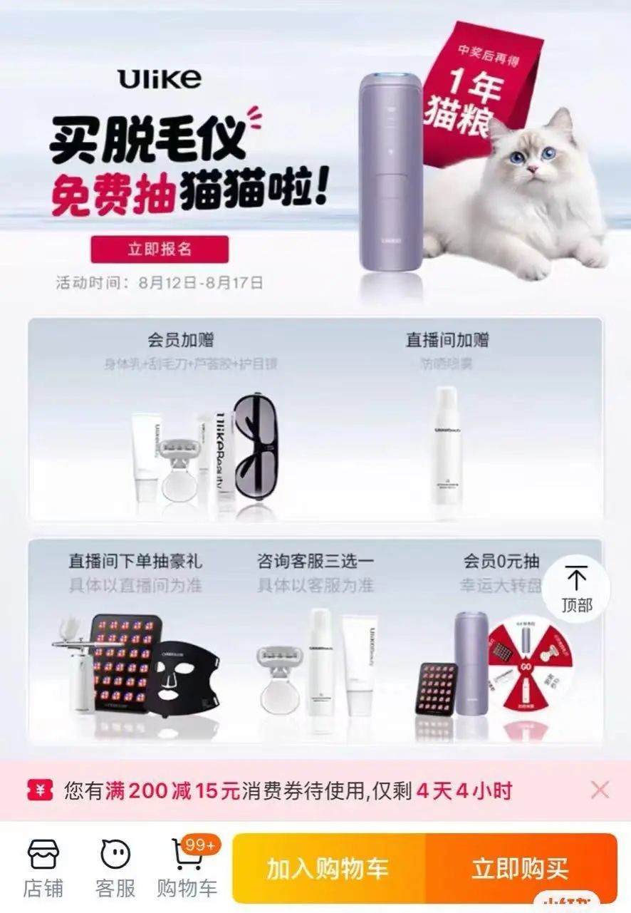 据悉,Ulike在其官方旗舰店贴出活动海报,称用户购买脱毛仪可免费抽取猫咪,中奖后用户还可以再获得一年的猫粮。但该活动被质疑是品牌利用动物进行营销,并未真正关注动物福利,而将活体宠物当成是赠品的行为,涉嫌物化动物、忽视动物福利。