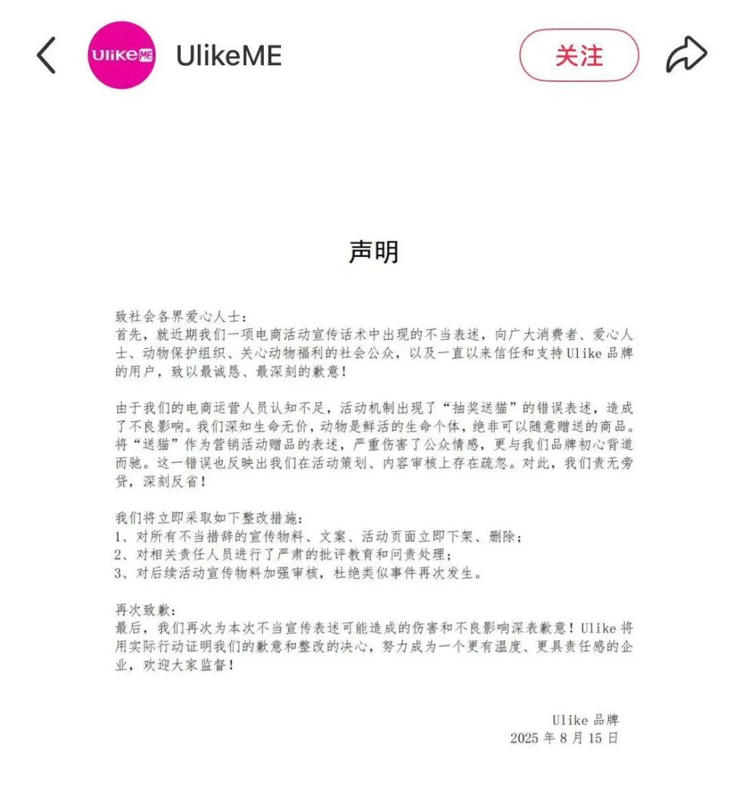 事件发酵后,Ulike通过官方账号紧急发布声明致歉,承认活动存在“抽奖送猫”的错误表述系电商运营人员认知不足,称动物是生命而非商品,并立即下架所有不当措辞的宣传物料、文案、活动页面,同时对相关责任人员进行严肃的批评教育和问责处理,承诺对后续活动宣传物料加强审核,杜绝类似事件再次发生。