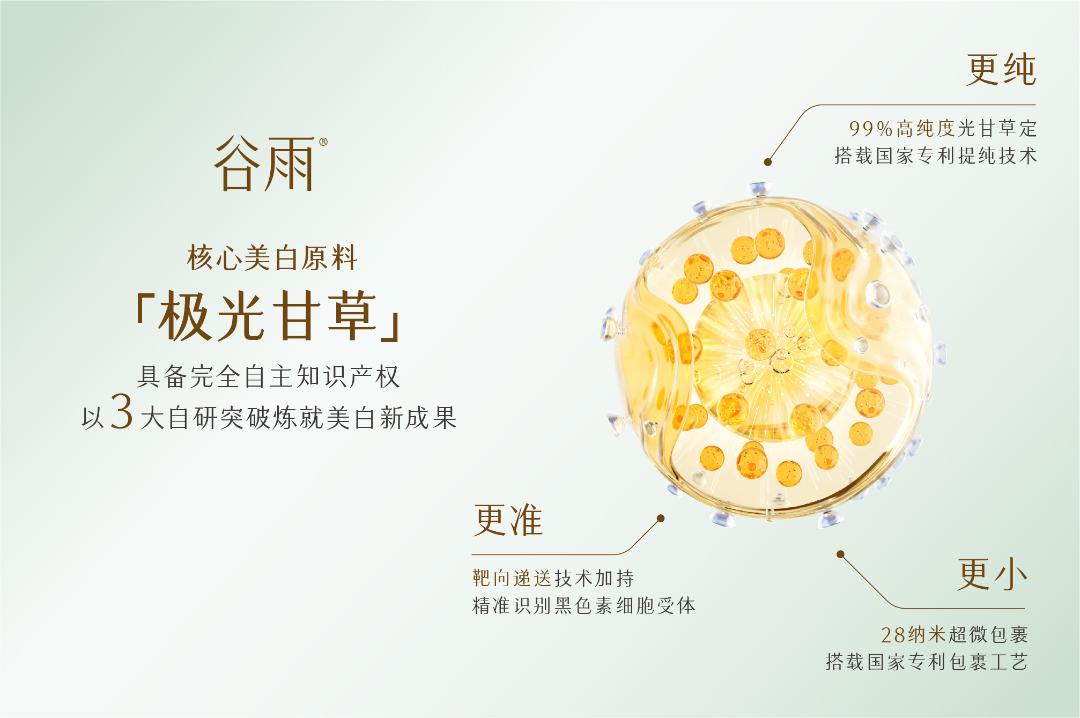 在美白需求爆发的大背景下,谷雨精准抓住了这一黄金赛道,从品牌起步时就已瞄准较为小众的美白原料——光甘草定,作为萃取自知名草本中药光果甘草的珍贵成分,光甘草定的美白功效早已被验证,而其珍稀的提取量更被誉为“美白黄金”。