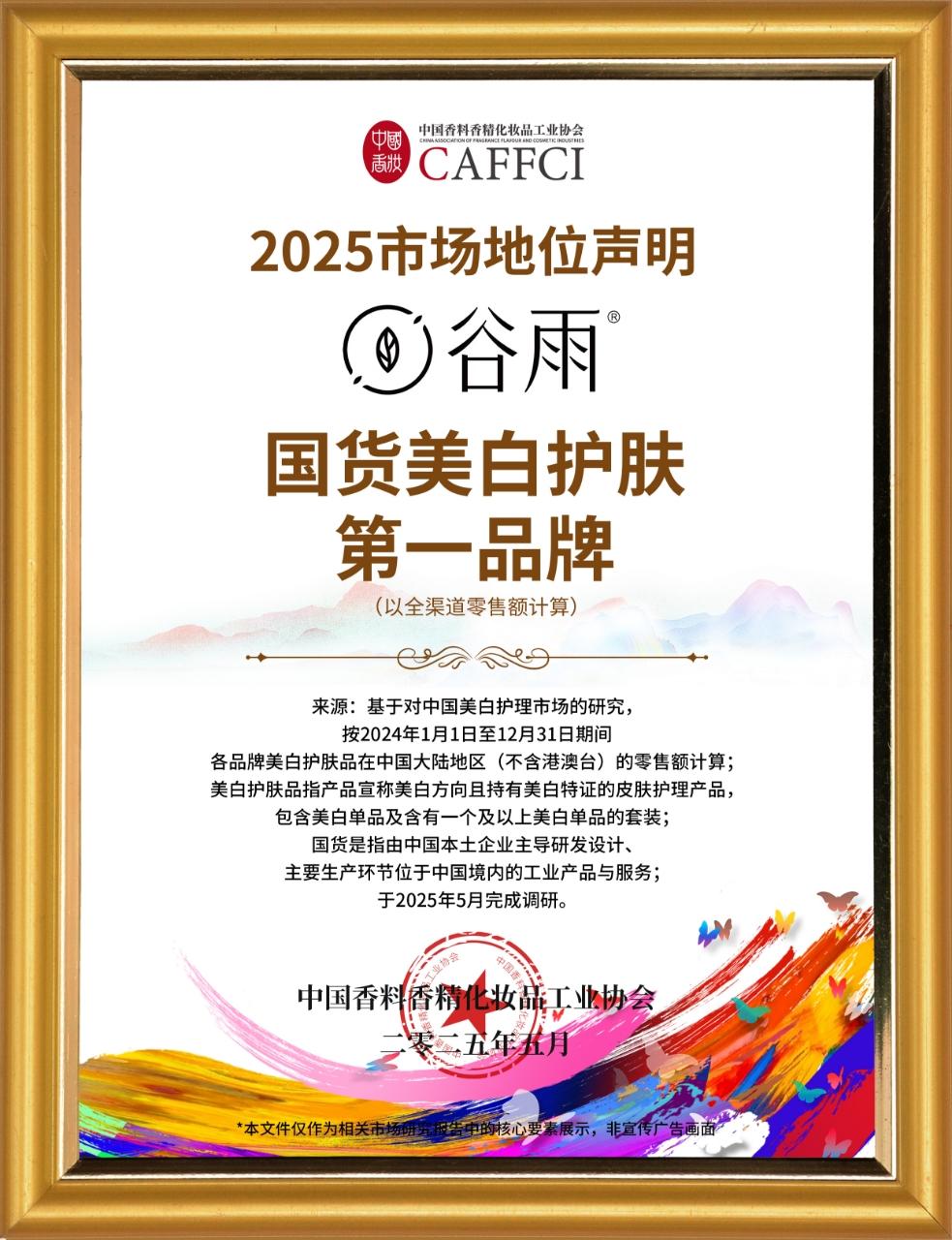 凭借在美白市场的优异市场表现,谷雨在中国香妆品牌发展大会上将“2025国货美白护肤第一品牌”的市场认证收入囊中,进一步巩固了其在美白领域的领导地位。