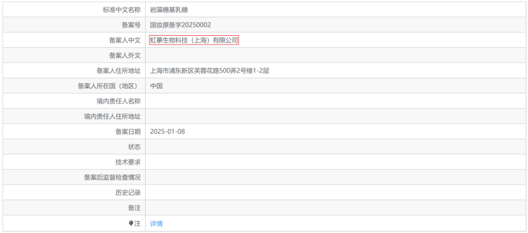 今年,虹摹生物更备案了一款名为"岩藻糖基乳糖"的化妆品新原料(国妆原备字20250002)。公开资料显示,岩藻糖基作为天然存在于海藻、菌类及真菌中的多糖,兼具保湿、抗氧化、抗炎及抗菌等多重生物活性。