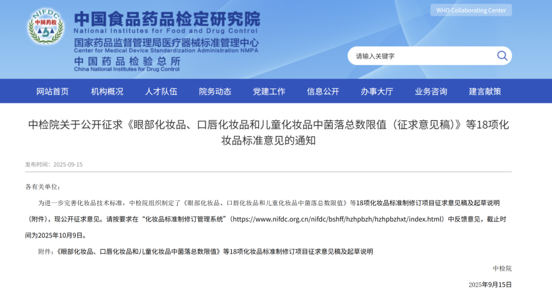 9月15日,中国食品药品检定研究院发布通知,就《眼部化妆品、口唇化妆品和儿童化妆品中菌落总数限值(征求意见稿)》等18项化妆品标准向社会公开征求意见,反馈截止时间为10月9日。