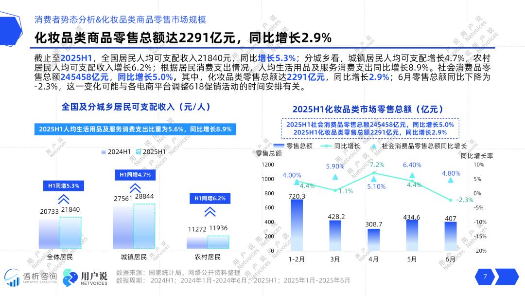 用户说数据显示,2025年上半年,社会消费品零售总额245458亿元,同比增长5.0%,其中化妆品类零售总额达2291亿元,同比增长2.9%;据国家统计局近日公布的8月份社会消费品零售总额数据显示,8月化妆品类零售额达349亿元,同比增长5.1%;2025年1-8月份化妆品类零售额达2915亿元,同比增长3.3%。