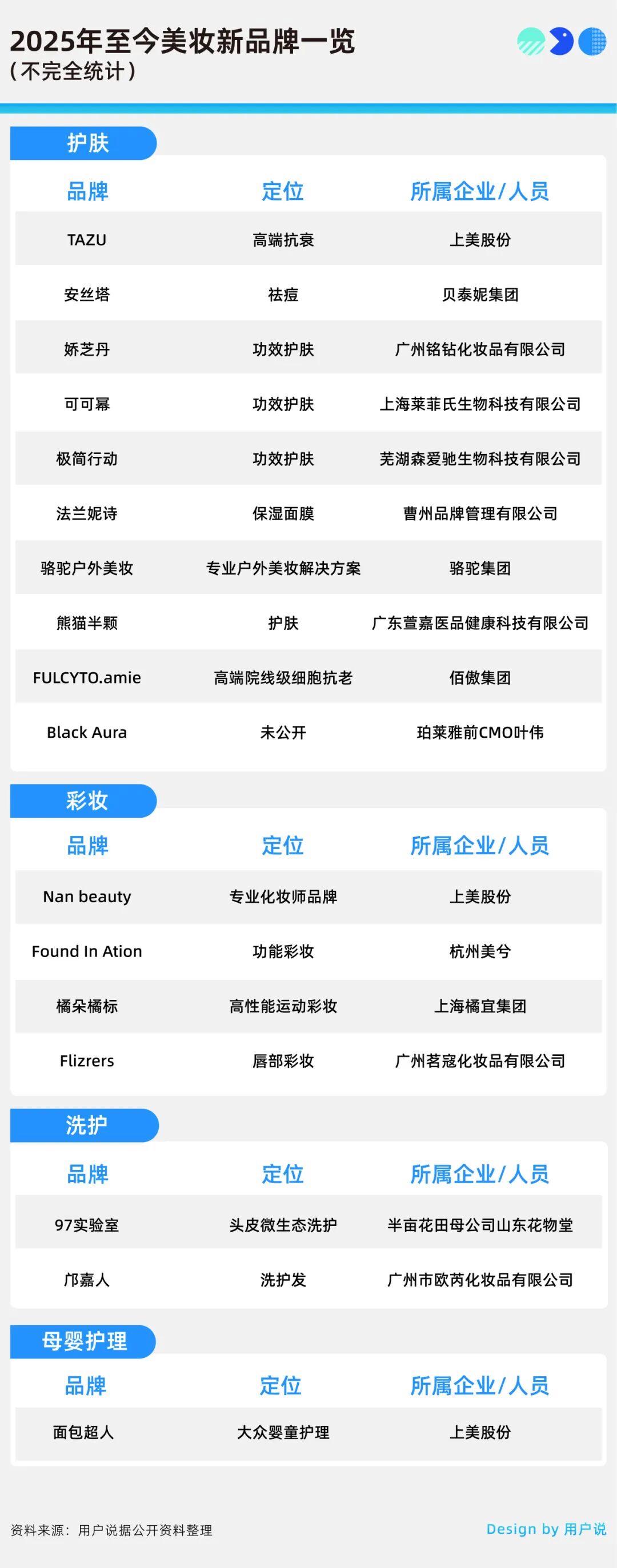 在旧品牌倒下之时,新品牌则蓄势待发,悄然登场。据用户说不完全统计,2025年以来共有16个美妆相关新品牌上线,包含护肤、彩妆、洗护及母婴护理共4大类型。其中护肤类新品牌数量最多,共有9个。