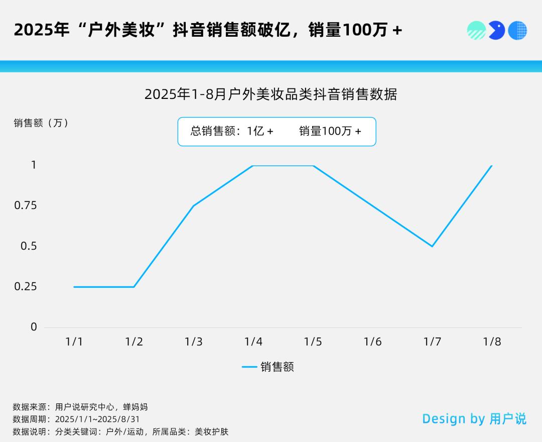 据蝉妈妈2025年1-8月户外美妆品类数据(分类关键词:户外/运动,所属品类:美妆护肤)显示,该周期内抖音平台户外美妆品类销售额突破1亿,销量达100万+,针对户外、运动的美妆市场正不断扩大。