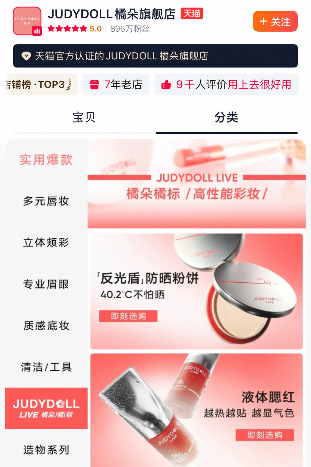橘朵橘标的首批产品同样将重点放在产品的功能性上,产品覆盖底妆、腮红、眼影、眉笔、保湿喷雾等多品类,围绕户外场景打造“5防0感”体验。其产品不仅仅围绕妆效展开,而是试图将防晒、持妆与舒适肤感融为一体,提供一套完整的“功能性妆容”解决方案。目前,橘朵已在其天猫旗舰店中划分出了橘朵橘标的分类版块,其持妆粉底液已售出4万+,反光盾防晒粉饼目前已售出1万+,市场热度有目共睹。