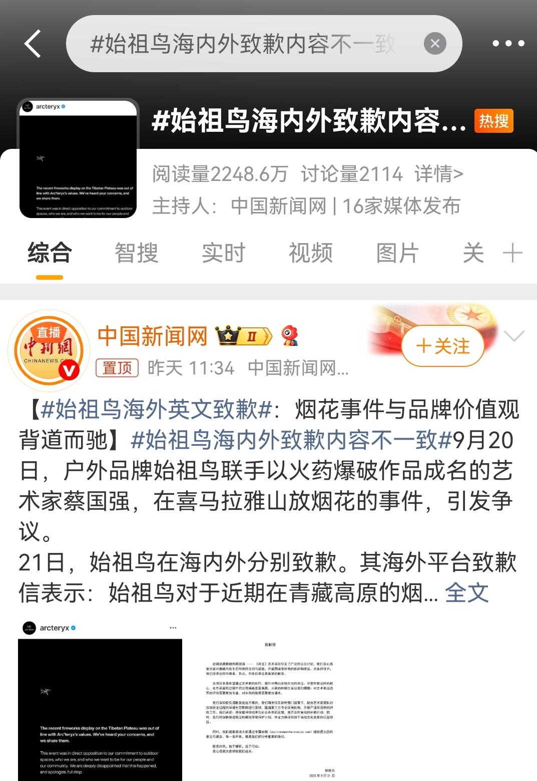 但这一切,并未能挽回已然崩塌的信任。9月21日下午,话题# 始祖鸟海内外致歉内容不一致# 又冲上了热搜。从两份致歉内容来看,国内版诚恳反思,海外版却暗示“中国团队擅自行动”,试图撇清责任。