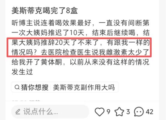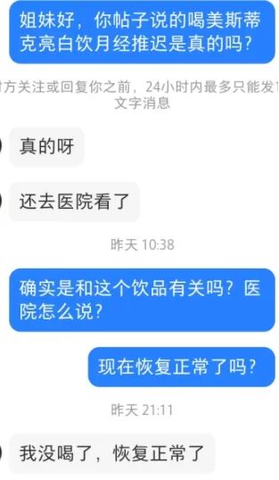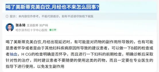 除了小红书上,在医院交流论坛上有女性咨询“喝了美斯蒂克美白饮,月经也不来怎么回事?”该医生则答复称:喝美斯蒂克美白饮月经出现延迟,可能是对药物的副作用所导致的。