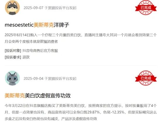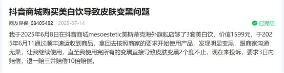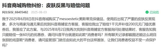如一名消费者在消费保投诉称,自己于2025年6月8日在抖音商城购买了mesoestetic美斯蒂克保健品,使用后出现了严重的皮肤反黑现象,多次与商家沟通无果后找到抖音商铺官方客服,客服给出了赔偿1千元并补偿200元无门槛优惠券。另一位消费保网友也投诉,抖音商城购买美斯蒂克美白饮导致皮肤变黑问题。