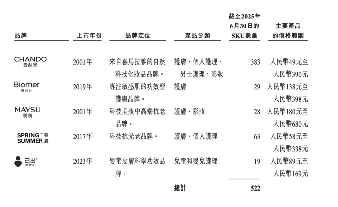 成立于2001年的自然堂现已成为中国第三大国货化妆品集团,旗下拥有五个主要品牌,即旗舰品牌自然堂以及珀芙研、美素、春夏、己出,提供涵盖护肤、彩妆、个人护理、男士护理以及儿童和婴儿护理的全方位产品系列。截至2025年6月30日,自然堂主要品牌共提供522个SKU。