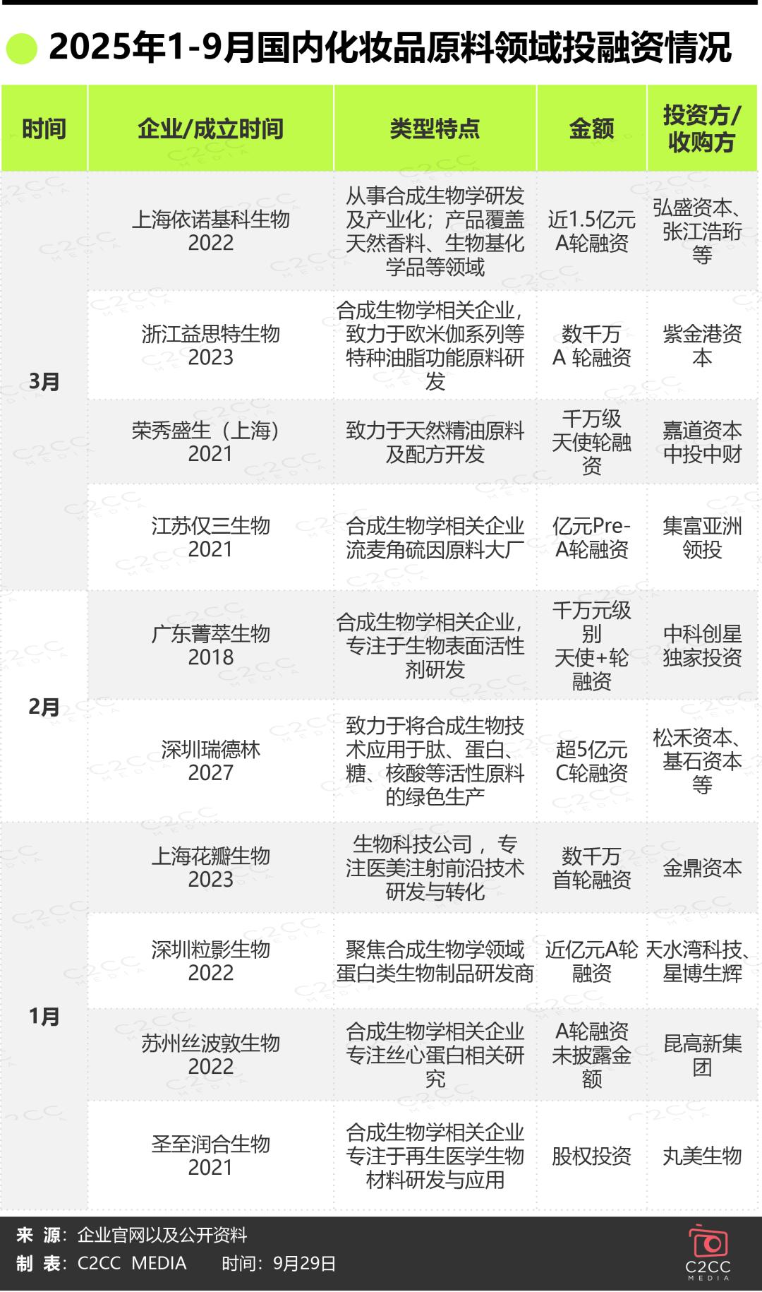 生物技术的突破正重塑全球产业格局,传统化工制造向低碳生物制造的转型已成必然。聚焦化妆品原料赛道,据C2CC传媒X新妆不完全统计,2025年1-9月,国内相关投融资事件至少31起,超8成资金流向合成生物学相关企业。