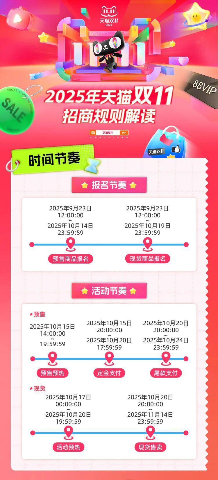 9月25日,天猫公布了2025年天猫双11招商规则。相比抖音“拉长战线,抢占先机”的策略,天猫则聚焦消费者体验,尤其是拉长现货期,被视为是一次“自我革命”。其活动周期为10月15日开始,至11月14日结束,。与去年预售时间相比没有提前,其中,仅有1波预售期,现货期更是被拉长至约24天。