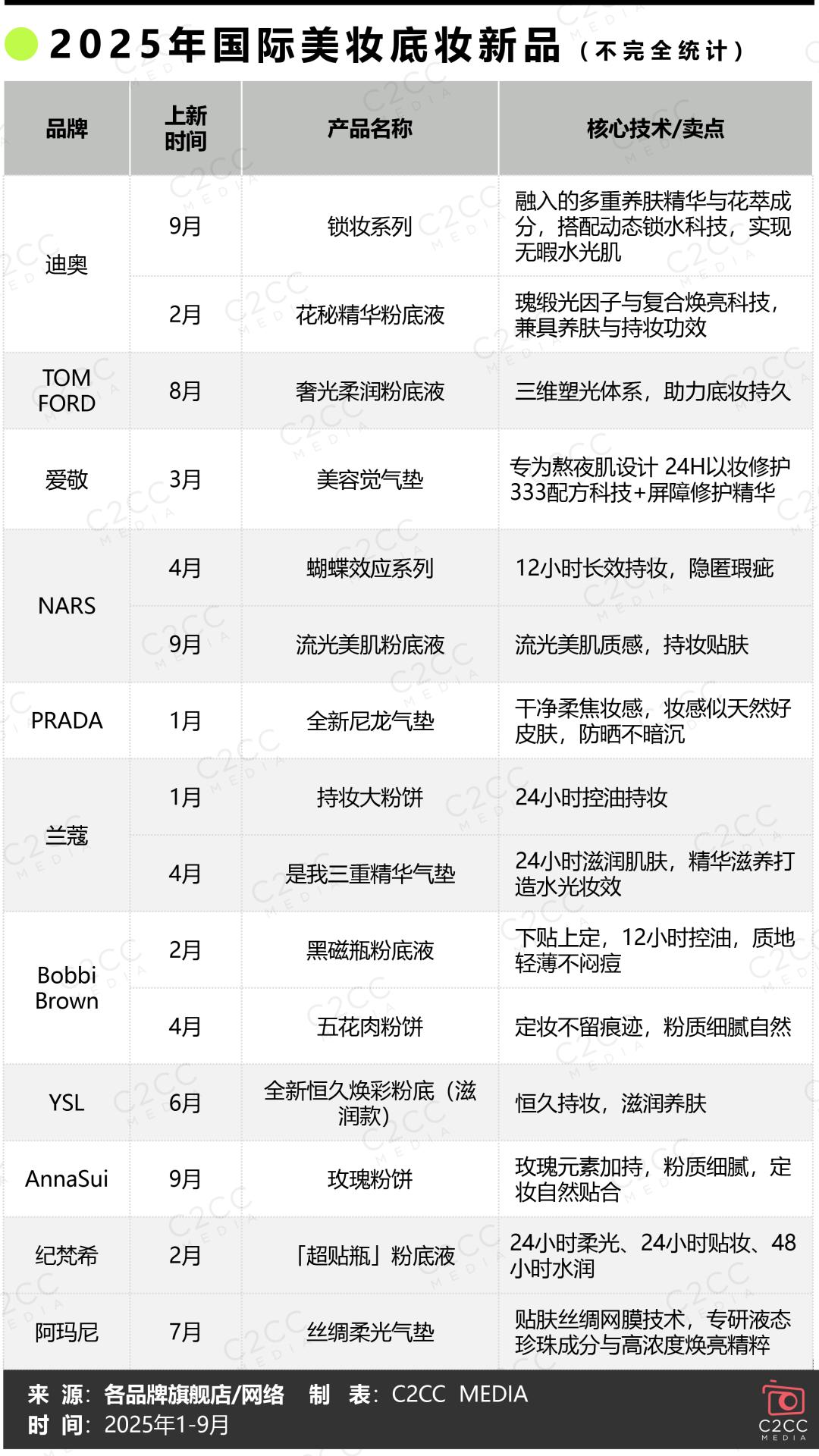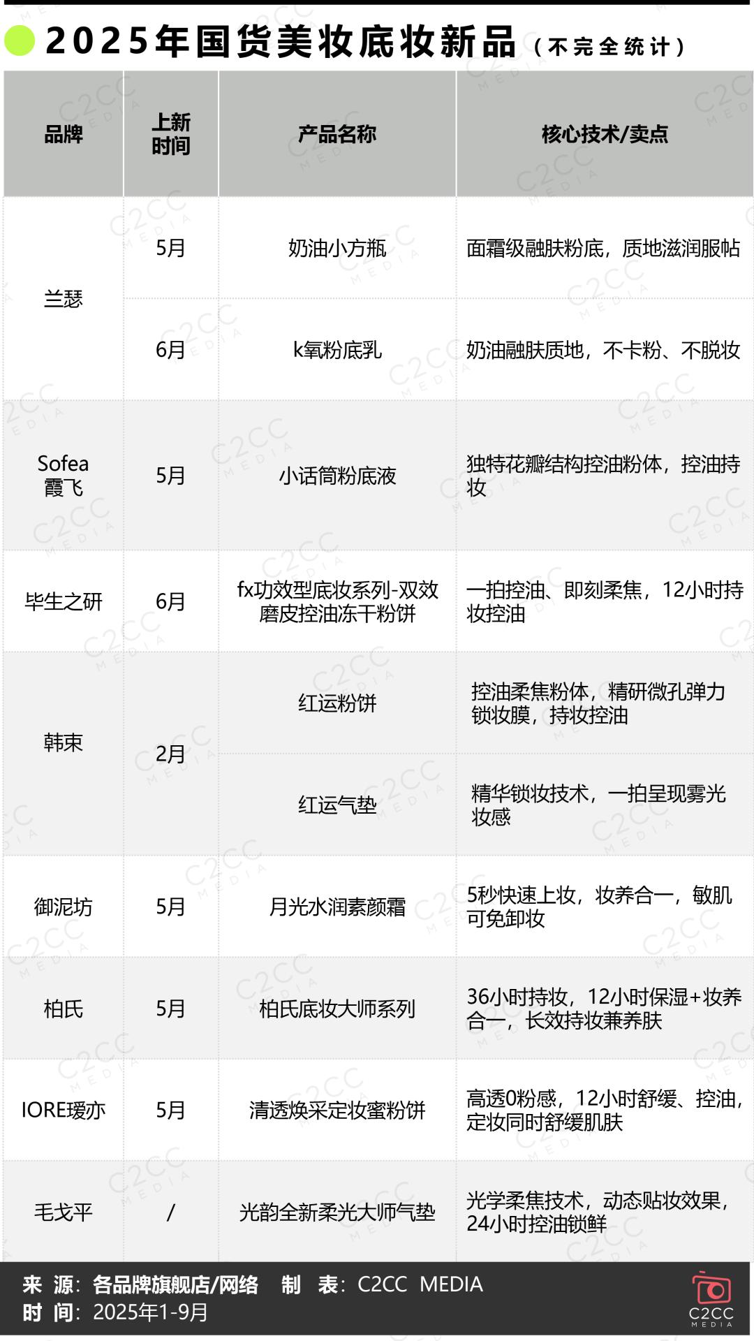 无论是国际大牌,还是国货头部企业,亦或是彩妆新锐,都在通过精准洞察消费变化,发力科研创新,2025年1-9月相继推出的各大底妆新品,从一饼多用的防晒粉饼、“妆养合一”精华粉底液,再到长效持妆且养肤的防水气垫、专为熬夜设计的“夜粉饼”,在多功能、多场景、多形态上打造差异化竞争,满足注重功效与性价比的大众消费者和追求奢享体验的高端客群。