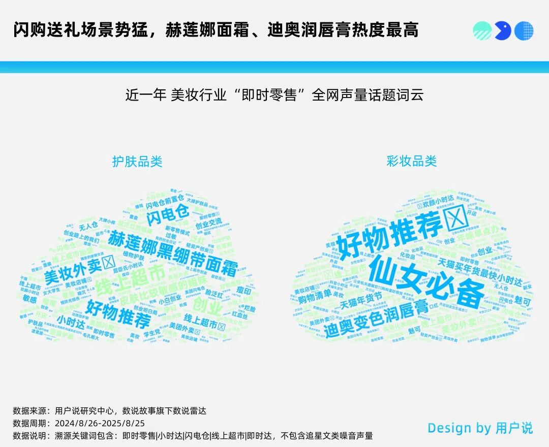 再看消费者端,选择美妆即时零售,根本是“快”和“场景”两个需求在推着走。以前网购护肤品,等个2-3天是常态,但外卖大战里,平台拼速度、拼补贴,让O2O的“即时可得”成了新习惯——试过30分钟就能拿到急需的护肤品,谁还愿意再等好几天?