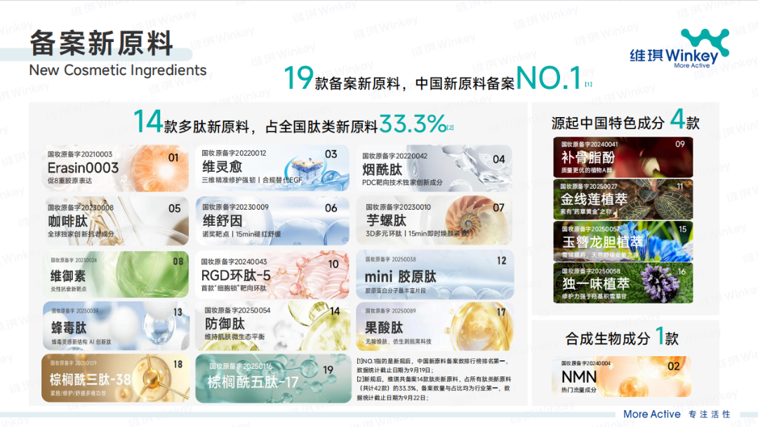 据悉,通过多肽等成分的科研创新,在丁文锋博士的带领下,维琪14年间就成为了国内多肽原料市场龙头企业。据弗若斯特沙利文数据显示,2024年,维琪科技以6.6%的市场份额领跑中国化妆品多肽原料行业。 作为国内“多肽原料大佬”,截至目前,维琪科技已储备了300多个创新分子,并备案了19项新原料,位居行业新原料备案数量之首,其中14项为肽类新原料、4项植物新原料、1项合成生物原料,一系列数字展现着维琪科技的硬实力。