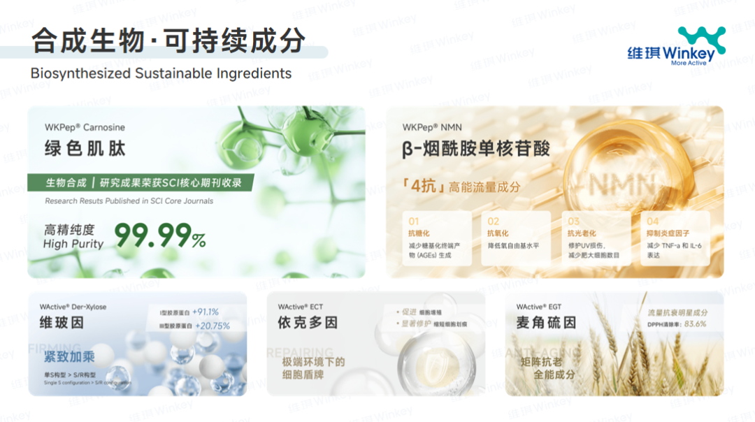 目前,维琪科技已通过绿色生物合成工艺,成功研发出绿色肌肽、脱羧肌肽、NMN等安全、高效、绿色的化妆品原料。