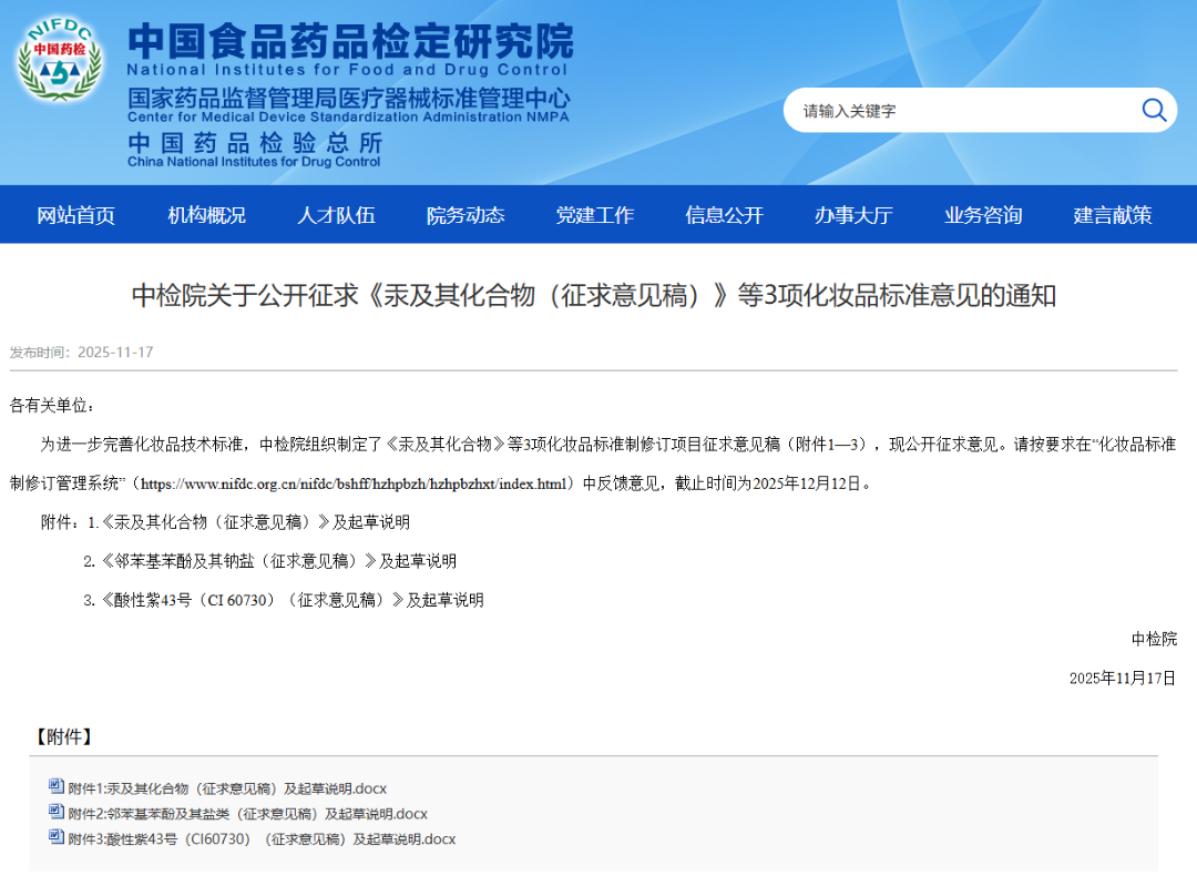 11月17日,中国食品药品检定研究院组织制定了《汞及其化合物》等3项化妆品标准制修订项目征求意见稿,拟全面禁止化妆品使用含汞原料,包括硼酸苯汞、硫柳汞等防腐剂,旨在与日本、东盟等国际标准接轨的同时,应对近年频发的化妆品汞超标事件,以提升产品安全。