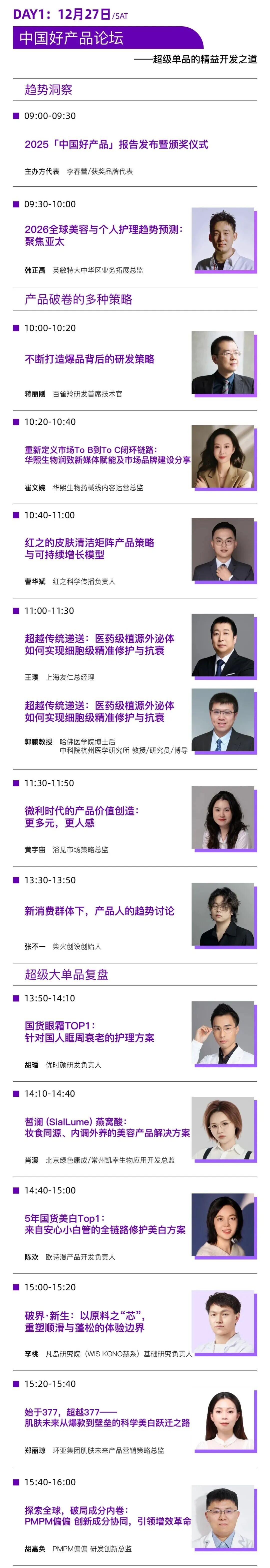 论坛围绕 「趋势洞察」、「产品破卷策略」「超级大单品复盘」3大核心议题展开。届时,来自英敏特、百雀羚、华熙生物、红之、上海友仁生物、浴见、柴火创设、优时颜、北京绿色康成、欧诗漫、凡岛、环亚集团肌肤未来、PMPM偏偏等企业的产品负责人,将每人进行20分钟深度路演,层层拆解超级单品从0到1的打造逻辑——从精准的消费者洞察与开品灵感激发,到严谨的原料筛选与配方精研,再到细腻的产品设计与科学传播,完整呈现一款成功产品背后的系统思考与实战路径。