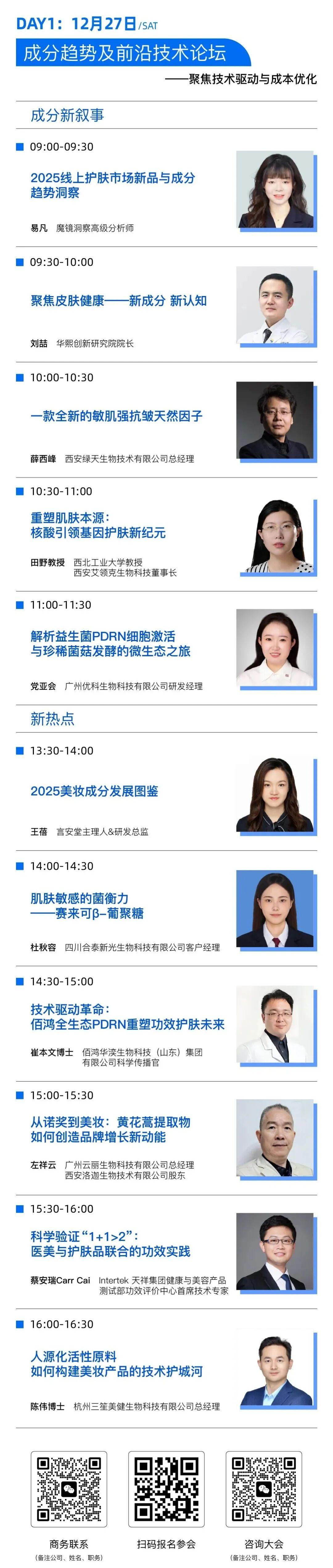 论坛特邀来自魔镜洞察、华熙生物创新研究院、西安绿天生物、西安艾领克生物、优科生物、言安堂、四川合泰新光生物、佰鸿华湙生物、广州云丽生物、Intertek天祥集团、杭州三笙美健生物(排名按出场顺序)等企业的研发专家与技术负责人,从市场数据、原料创新、配方技术等多维角度,系统梳理未来成分趋势,拆解前沿技术成果,为我们呈现一场兼具深度与前瞻性的行业对话。