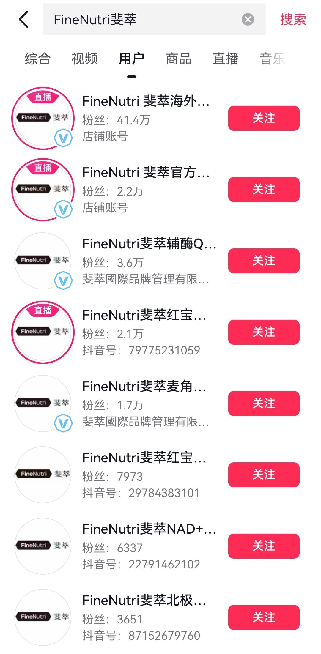 为支撑这一模式,斐萃搭建了多账号、多层次的直播矩阵。旗下多个蓝V账号保持近90天连续开播,其中主力账号如@FineNutri 斐萃海外旗舰店、@FineNutri 斐萃官方海外旗舰店、@FineNutri 斐萃麦角硫因小紫瓶、@FineNutri 斐萃红宝石鱼油直播间等均采用“日不落” 直播模式,最大限度降低用户流失。
