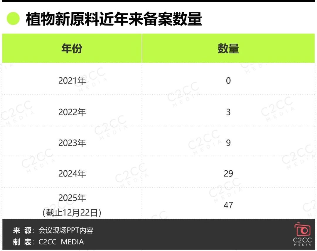 值得关注的是,植物来源原料有88条,占比近四分之一,且2025年植物新原料注册备案量已超过前四年总和,生物技术原料中绝大多数也以植物为基础开发,化妆品行业对植物原料的研发热情空前高涨。