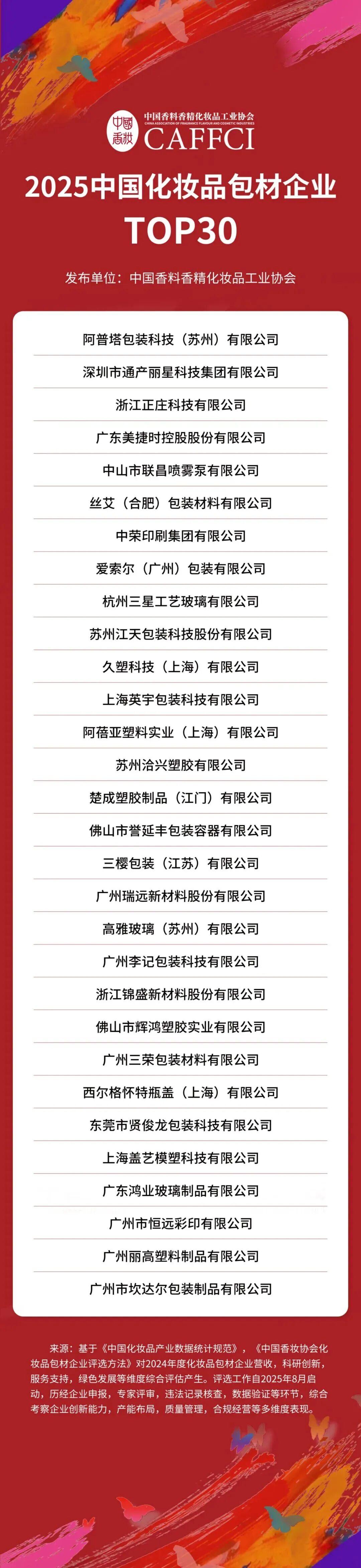 因此,中国香妆协会以科学性、公正性、可比性、导向性等原则,根据市场表现,科研创新、绿色发展、服务支持等指标,最终筛选出2025年中国化妆品包材企业TOP30入围名单,包括阿普塔包装科技(苏州)有限公司、浙江正庄科技有限公司等,并在现场颁发证书。