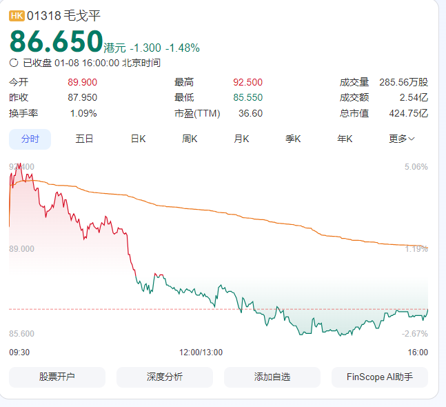 然而市场反应却出人意料。减持公告发布次日,公司股价不跌反涨,1月7日盘中涨幅一度超8%,收盘报87.95港元。公司总市值维持在427亿港元左右。
