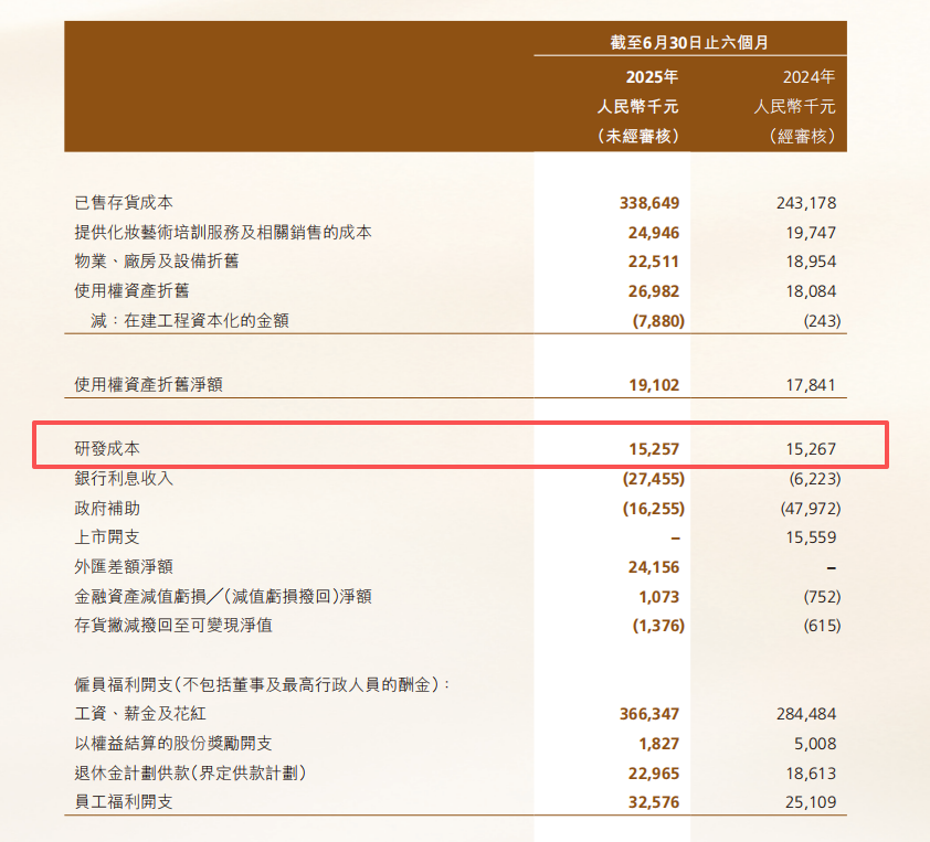 此外,毛戈平股份“轻研发”的标签依然显著。2025年上半年,其研发费用仅1525.7万元,营收占比0.59%,远低于3%的行业“基准线”,甚至不及行业上市公司平均水平的五分之一。