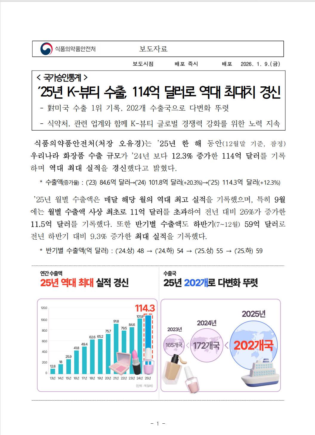 近日,韩国食品医药品安全处公布2025年韩国化妆品出口数据显示,去年韩国化妆品出口额达114.3亿美元,同比增长12.3%,创历史新高,首次跃居全球第二。其中,月均及下半年出口均刷新纪录,尤其是下半年增速尤为明显,9月份出口额首次突破11亿美元,达 11.5 亿美元,单月增幅同比高达26%。