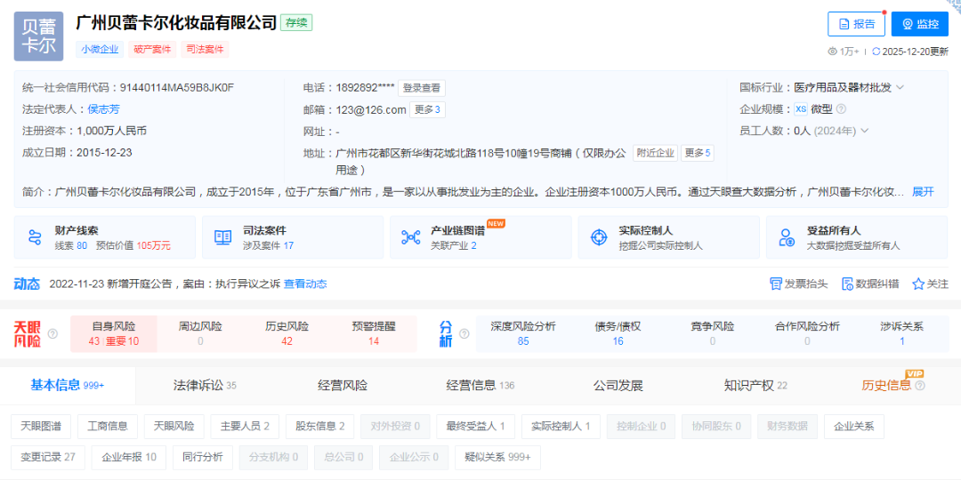 公开资料显示,贝蕾卡尔成立于2015年12月,注册资本认缴1000万元。早在2021年,贝蕾卡尔便出现了经营危机,曾因多起纠纷被16次限制高消费。其注册的 “贝蕾卡尔” 品牌曾备案14款美妆产品,但2022年起陆续取消备案,如今主流电商平台已无相关产品在售。