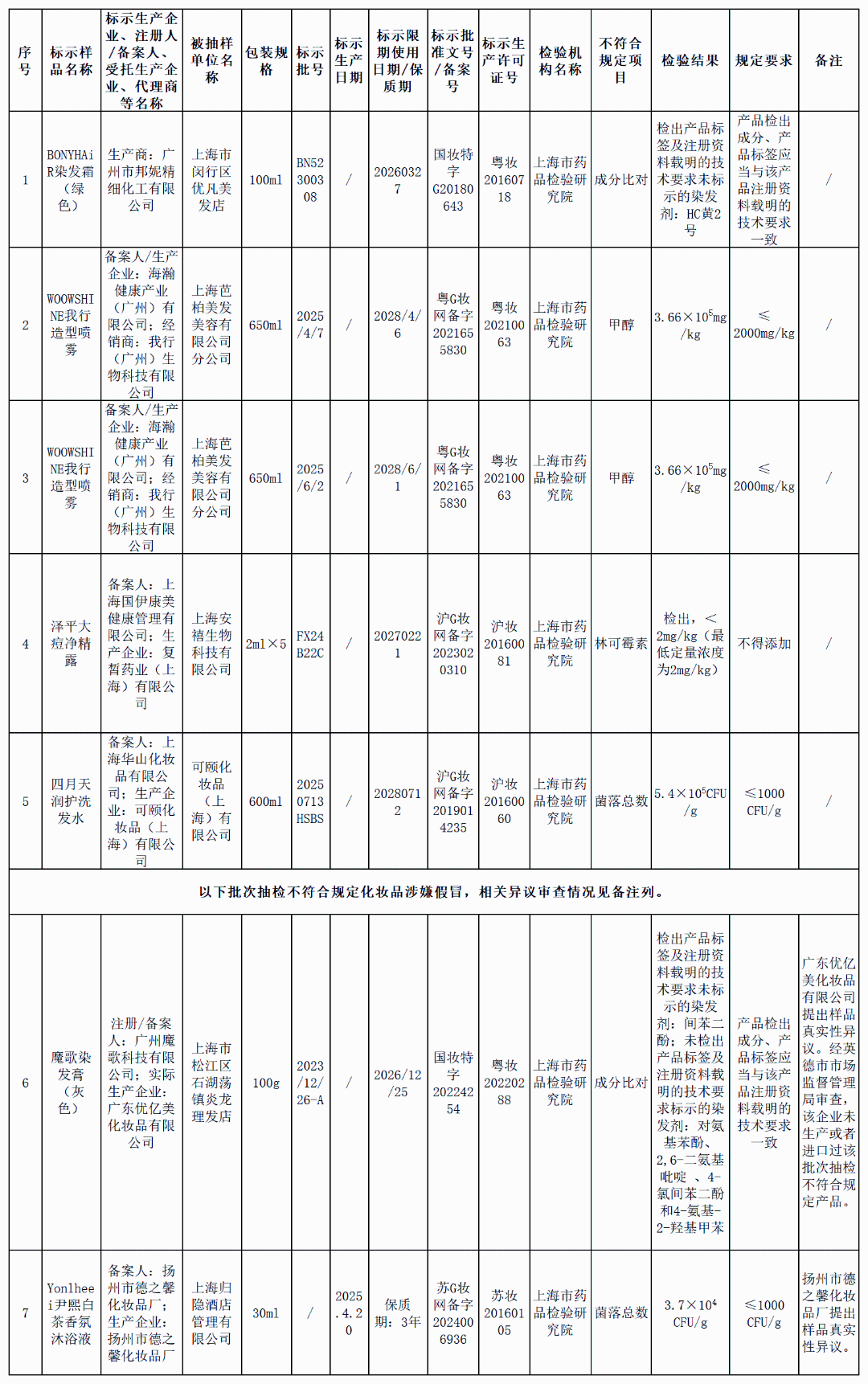 近日,上海市药品监督管理局通告7批次不合格化妆品,涉及产品涵盖染发、造型喷雾、祛痘及洗护等品类,目前监管部门已依法查处。