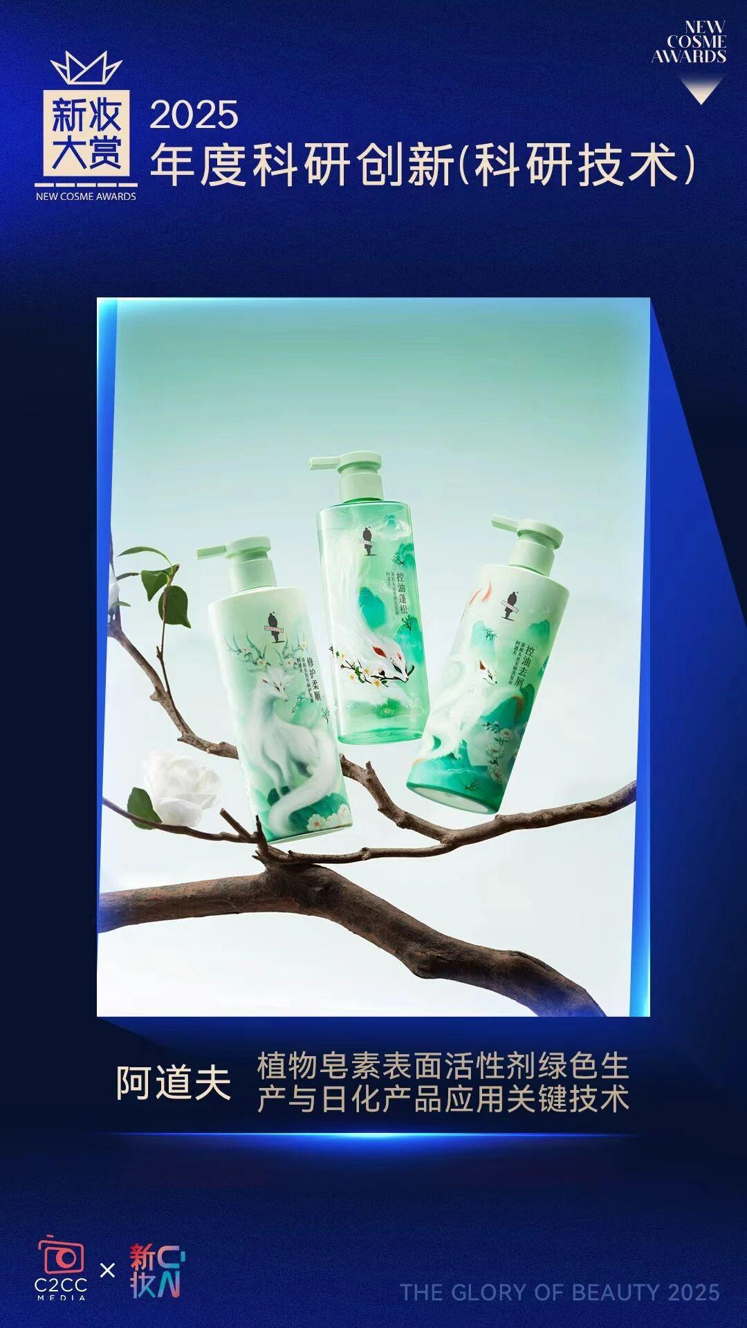 植物皂素表面活性剂绿色生产与日化产品应用关键技术,是由阿道夫集团联合江南大学、北京林业大学、中华全国供销合作总社南京野生植物综合利用研究所共同研发。2025年该技术被授予“中国好技术”称号并入选项目库(A类),成功入选“中国化妆品行业十大科技进展”,技术成果经权威机构鉴定达到国际领先水平。