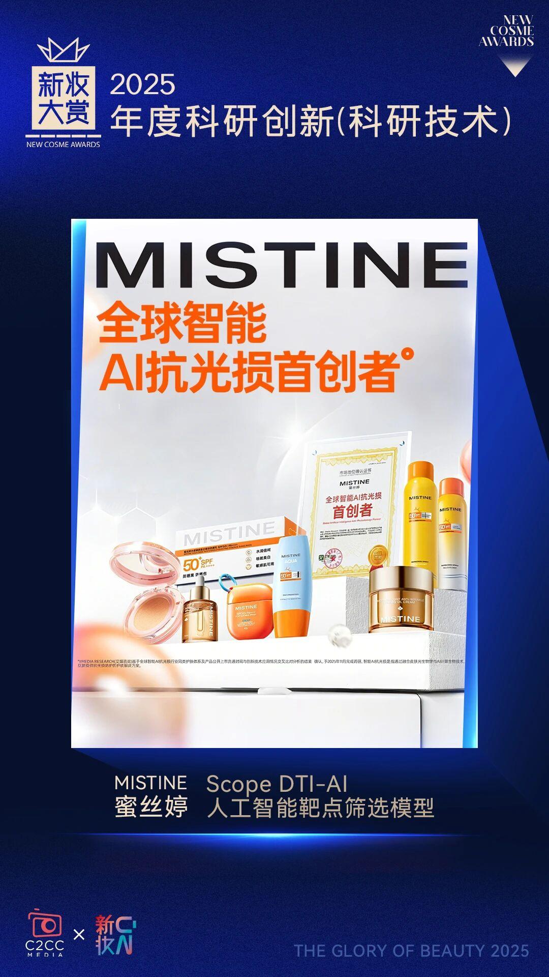 MISTINE蜜丝婷与诺贝尔奖得主联合实验室共同研发的Scope DTI-AI人工智能靶点筛选模型,是一款美妆行业首个自主训练的、服务于研发全链条的“AI大脑”,该研究成果已于2025年12月发表在国际顶级学术期刊《Nature Communications》,彰显了该技术的科研认可度。