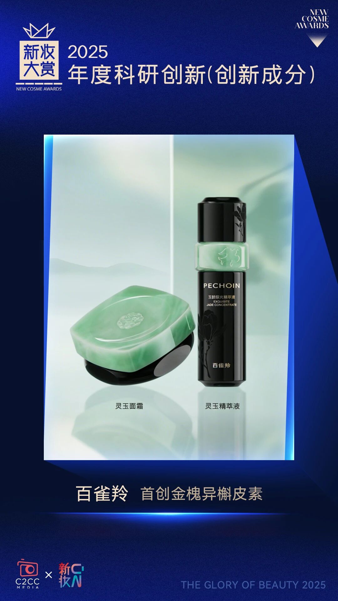 2025年8月,百雀羚推出灵玉系列,包括百雀羚玉龄琮光精华霜(焕新配方)、百雀羚玉龄琮光精萃液(焕新配方)、百雀羚玉龄琮光精华液(焕新配方),灵玉系列全线首发创新成分——金槐异槲皮素。