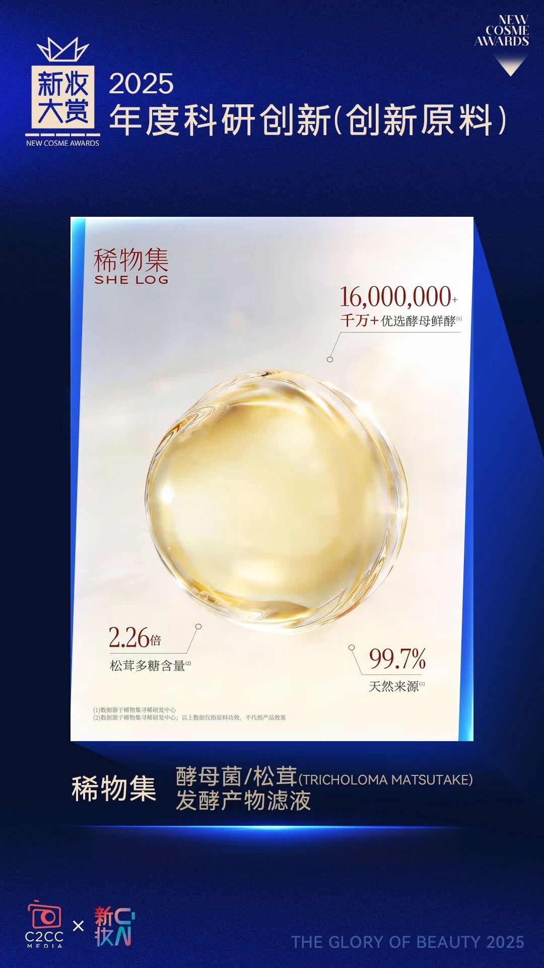 2025年2月,酵母菌/松茸(TRICHOLOMA MATSUTAKE)发酵产物滤液成功通过国家药监局备案(国妆原备字20250013),成为中国首个松茸发酵化妆品新原料,填补了松茸发酵原料的空白,该原料还获得了中国发明专利授权(ZL202211364506.1-一种具有修复抗衰功效的松茸酵母发酵液的制备方法及其应用),更凭借其卓越创新,一举摘得“2025个人护理品行业——荣格技术创新奖”。