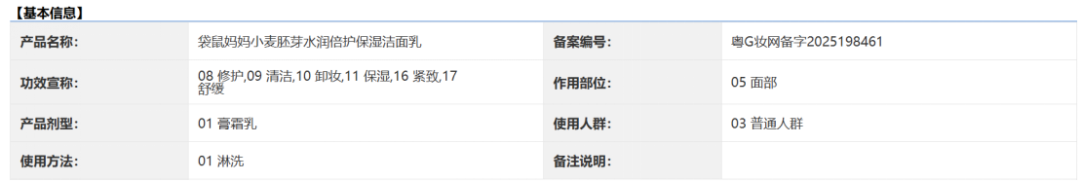 可记者在国家药监局国产特殊化妆品注册信息中查询发现,袋鼠妈妈小麦礼盒的五款核心产品 —— 小麦胚芽水润倍护保湿洁面乳、柔肤水、保湿乳、维稳精华液、保湿霜,均无特殊化妆品注册信息。